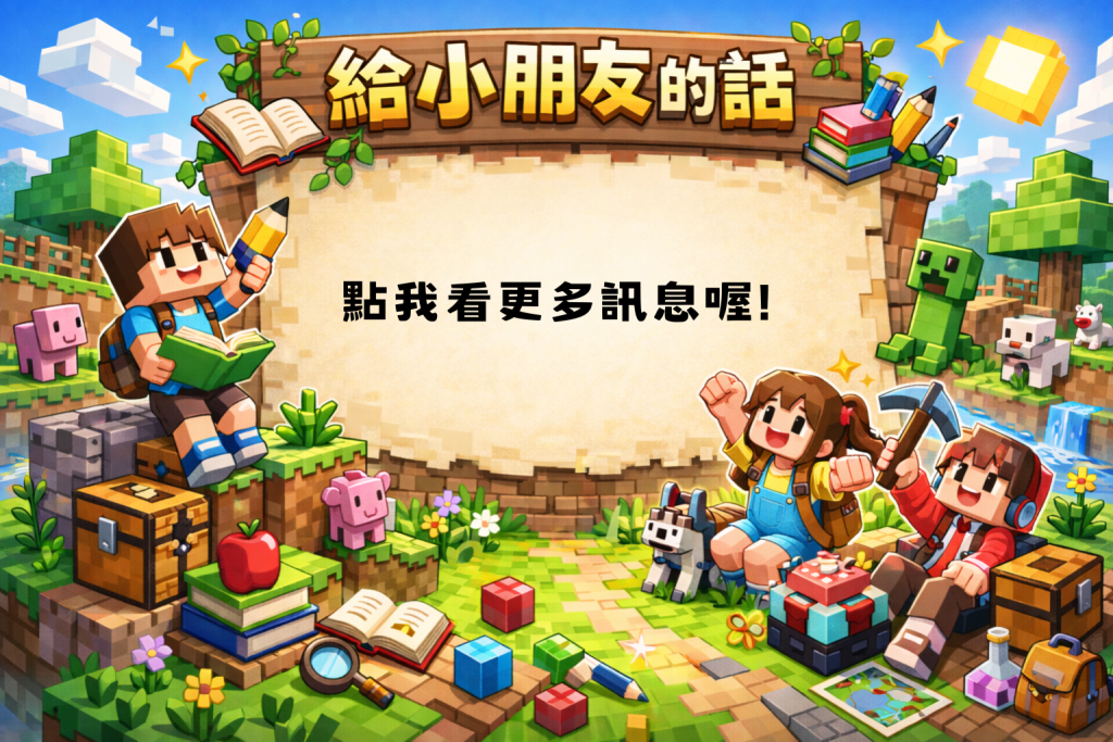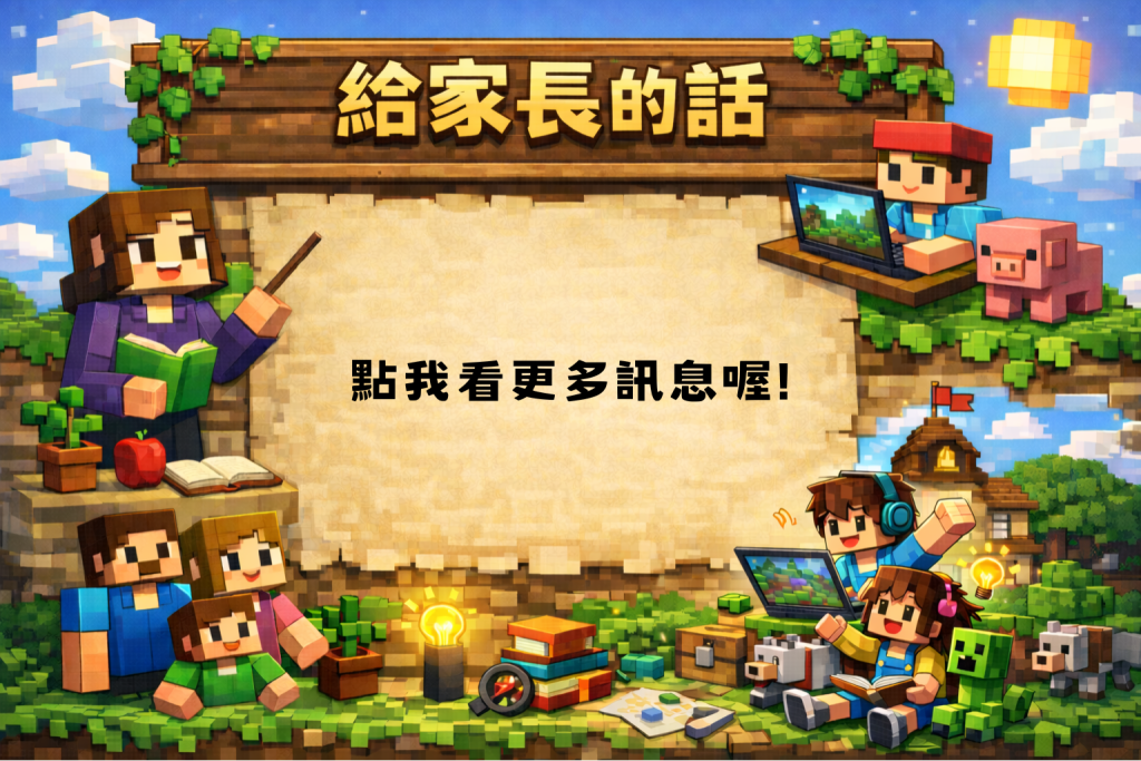 🌟 歡迎來到孩子的麥塊創造力世界 🌟 親愛的家長與小朋友您好!在這裡,我們相信學習不只是課本上的知識,而是充滿 想像力、挑戰與成就感 的冒險。透過有趣的互動課程與麥塊世界探索,孩子在遊戲中學會 邏輯思考、問題解決、創造設計與程式思維! 我們希望孩子在 快樂中建立自信,在挑戰中培養思考力,讓每一次創作都成為成長的養分。 ✨ 讓我們一起陪伴孩子,從興趣出發,開啟屬於他們的數位創造力未來 ✨👇 點下方按鈕了給家長的話/給小朋友的話/老師介紹,以解更多內容! Post Views: 464